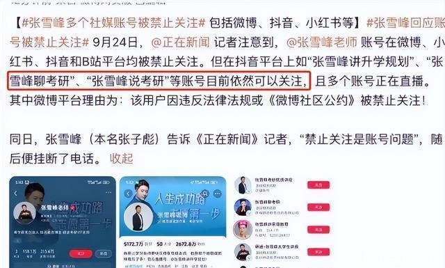 9月24日,有网友发现,张雪峰或许摊上了大事。 因为他的微博、抖音、B站、小红书等各大社交平台账号,在一夜之间被突然封禁。 并且无一例外都被贴上“因违反某种公约禁止关注”的标签。