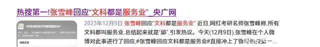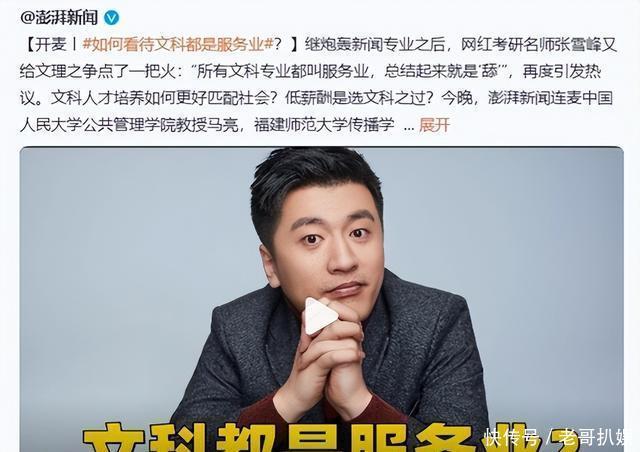 2023年,张雪峰在直播时,为了让家长纷纷购买自己的“升学规划心得”。 于是就文科进行了概括,甚至大言不惭的表示:“所有的文科都是服务业”! 例如“律师就是销售”、“新闻无用论”、“闭眼摸专业都比文科强”等极端言论。
